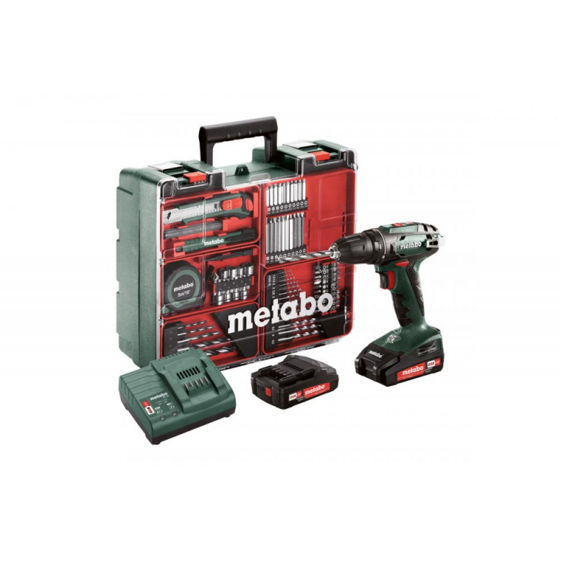 rychloupínací sklíčidlo, spona na opasek, 2 akumulátorové články Li-Power (18 V/2,0 Ah), Nabíječka SC 30, plastový kufr, Sada příslušenství