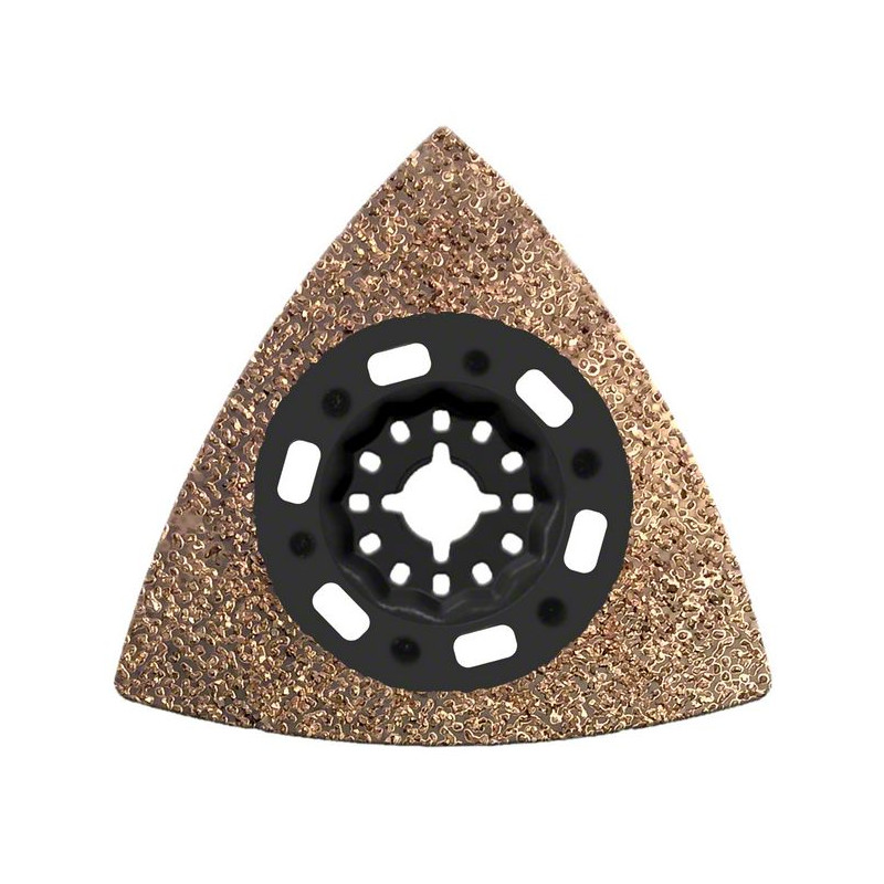 Brusná deska Starlock AVZ 90 RT2 s karbidovou drtí RIFF poskytuje výkon a velmi dlouhou životnost při odstraňování malty a lepidla na obkládačky. Deska je opatřena povlakem s jakostní karbidovou drtí hrubosti 20 a má tak vynikající odolnost vůči opotřebení. Otevřený karbidový povlak umožňuje rychlé odstraňování materiálu bez zanášení a hromadění. Deska díky povlaku vydrží déle. Deska má deltovitý tvar a umožňuje díky tomu práci úzkých rozích. Tato deska je ideální volbou pro odstraňování zbytků malty, lepidel na obkládačky či koberce z minerálních povrchů a pro rašplování dřeva za účelem hrubé úpravy tvaru. Upínací systém zajišťuje maximální přenos výkonu díky trojrozměrně konstruovanému spojení mezi nářadím a nástrojem. Tento produkt je kompatibilní s veškerým nářadím Starlock, Starlock Plus a Starlock Max, jakož i s běžným multifunkčním nářadím.