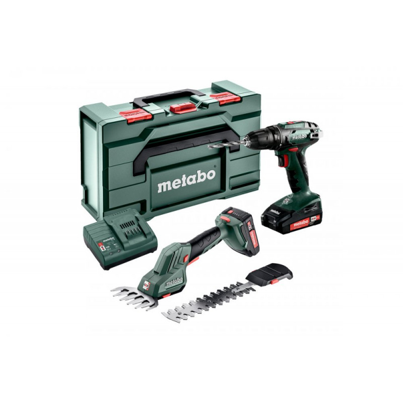 BS 18, SGS 18 LTX Q, 2 x akumulátorový článek LiPower (18 V/2,0 Ah), nabíječka SC 30, metaBOX 165 l, nůž na trávu 11,5 cm, nůže na keře 20 cm