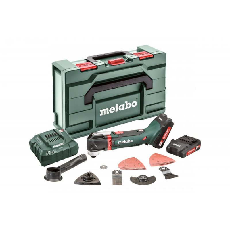 Ponorný pilový plátek 32 mm HCS (dřevo), Segmentový pilový list 85 mm BiM (dřevo + kov), Pevný škrabací nůž 52 mm HCS, Trojúhelníková brusná deska 93 mm se suchým zipem, 5 brusných kotoučů se suchým zipem 93 mm P 80, 5 brusných kotoučů se suchým zipem 93 mm P 120, odsávací adaptér, multifunkční adaptér, 2 akumulátorové články Li-Power (18 V/2,0 Ah), Nabíječka ASC 55 "AIR COOLED", metaBOX 145 L
