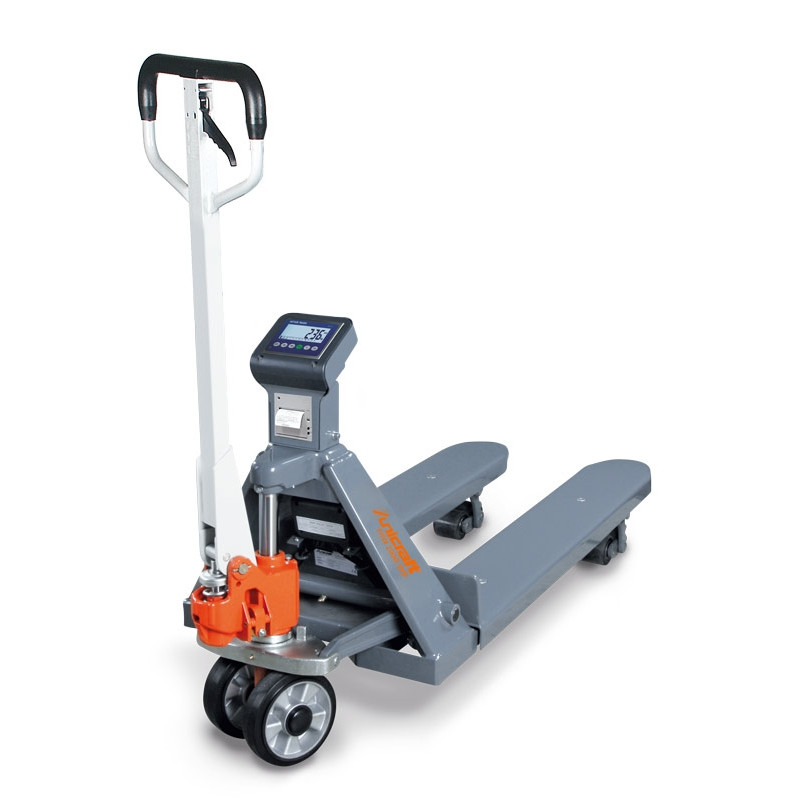 Profesionální paletový vozík se zvedací silou 2 tuny a integrovanou elektronickou váhou a tiskárnou, vhodný jako kontrolní váha pro každodenní použití.