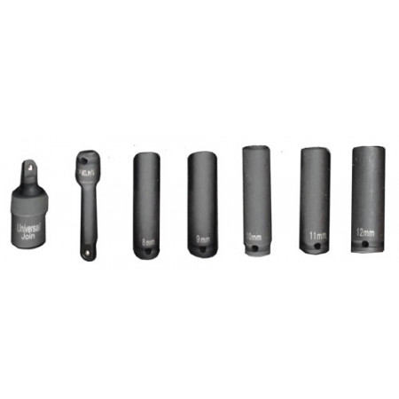 Sada obsahuje: dlouhé utahovací ořechy 8, 9, 10, 11 a 12 mm, kulový kloub a prodlužovací nástavec