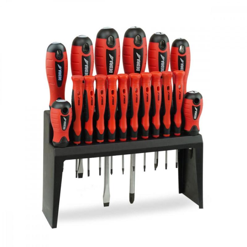 Sada 18 šroubováků DEDRA 06A095 je vynikající volbou pro dovybavení jakékoli dílny nebo garáže. Šroubováky DEDRA jsou vyrobeny z CrV, chrom-vanadové oceli, která se vyznačuje vysokou pevností a odolností proti korozi. Tvarovaná rukojeť je vyrobena z kombinace plastu a gumy. Taková kombinace poskytuje uživateli pohodlí během práce. Magnetický hrot zajišťuje přesnost a usnadňuje práci se šroubovákem na těžko přístupných místech. Robustní stojan zajišťuje pořádek a snadný přístup k šroubovákům na pracovišti.